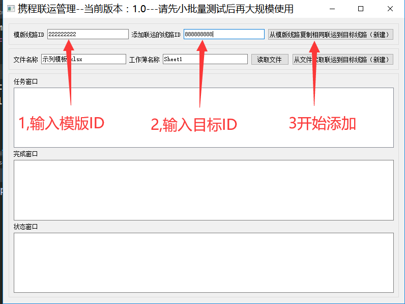 ### 1输入模版ID(已做好联运的ID) ### 2输入目标线路ID(需要添加联运的ID) ### 3点从模版复制开始添加联运 联运出发地,资源使用城市,联运名称,联运描述从模版线路读取,会在目标线路里新建相同内容的联运。目标线路必须是长途旅游才能添加,短途旅游不能添加联运。